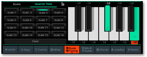- On-screen Quarter Tone and Arabic Scale, memorized in the Keyboard Sets; Presets assignable to any button or footswitch