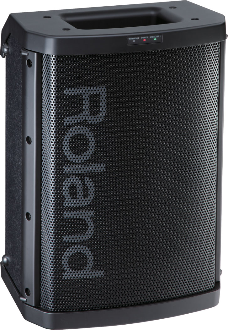 The BA-55 package includes a high-quality wireless microphone (DR-WM55). Designed specifically for this system, the mic has Power On/Off and Echo On/Off switches. The Echo switch is linked to the BA-55’s Echo/Reverb effect, which lets you enable and disable it directly from the mic. This is a very handy feature, allowing the effect to be quickly turned off when speaking or making announcements, then easily switched back on for singing.