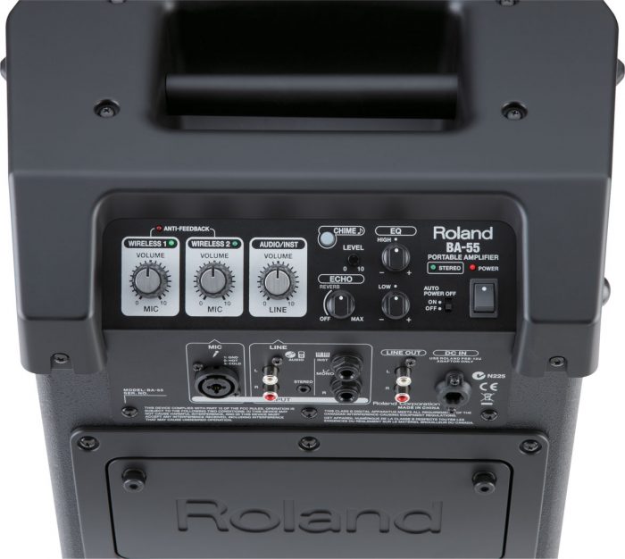 Onboard the BA-55 is an Echo/Reverb that sounds great and is easy to use, with a single knob that adjusts both the effect type and amount. When you turn the knob from the Off position to 12 o’clock, you activate a natural plate-reverb-type effect that adds a natural ambience to your voice and/or instruments. When you turn from the 12 o’clock position to maximum, you switch to a repetitive echo-type effect. The echo/ reverb can also be turned on and off from the included DR-WM55 wireless microphone for convenient remote control (see below).