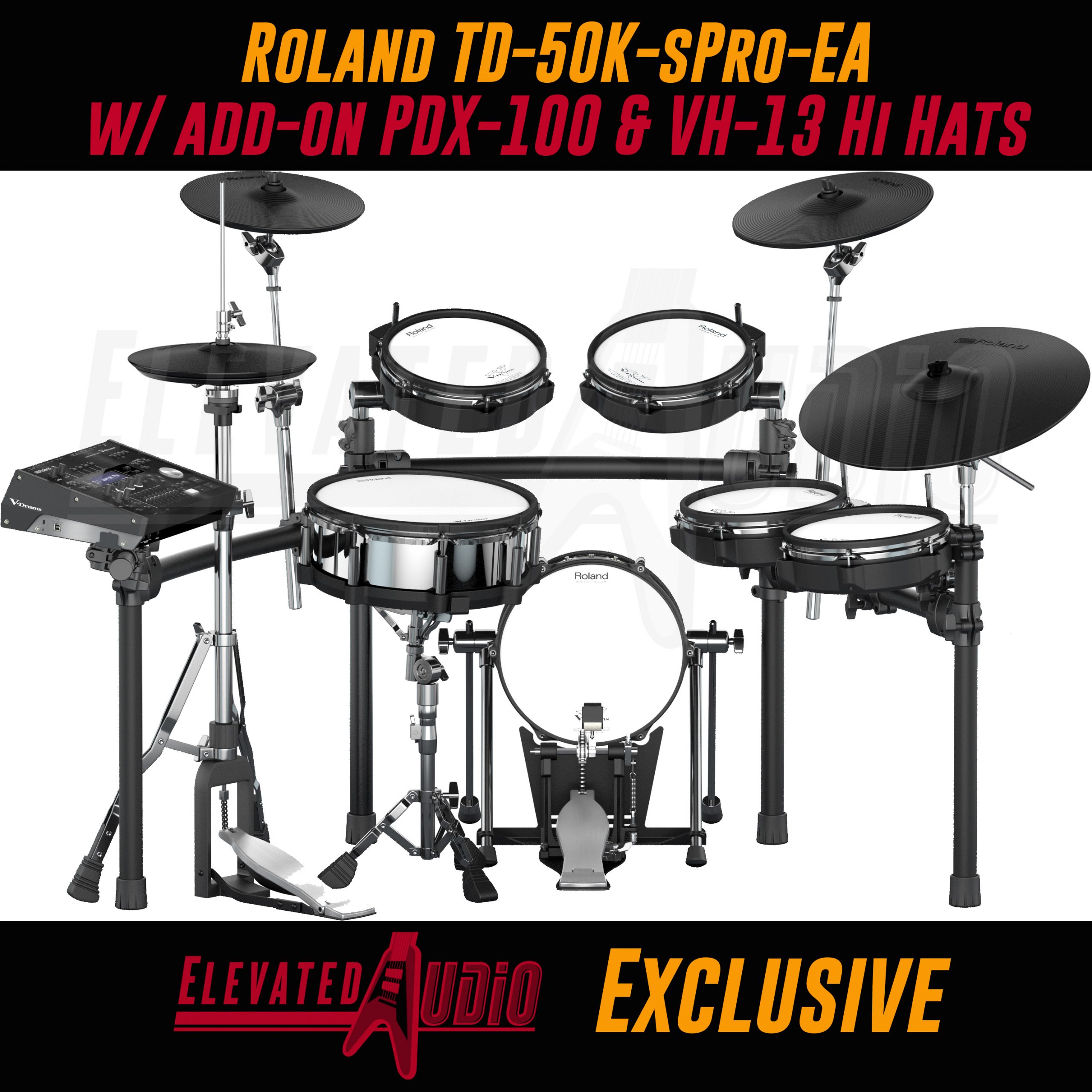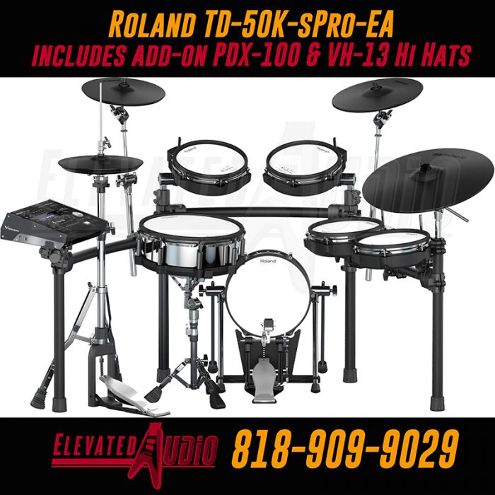 The TD-50K-sPro-EA is an Elevated Audio EXCLUSIVE configuration that features an additional pdx-100 tom pad w/ mdh-25 mount and upgrades the vh-11 hi hats to VH-13 hi hats (compared to a traditional TD-50K). These upgrades make the TD-50K-sPro-EA a FANTASTIC V-Drum Kit that has quickly become the most popular version of the TD-50 series kits. Configured by Elevated Audio in conjunction with the top brass at Roland, this kit has everything on your wish list. We are the ONLY dealers in the country who have this kit, get YOURS today !!